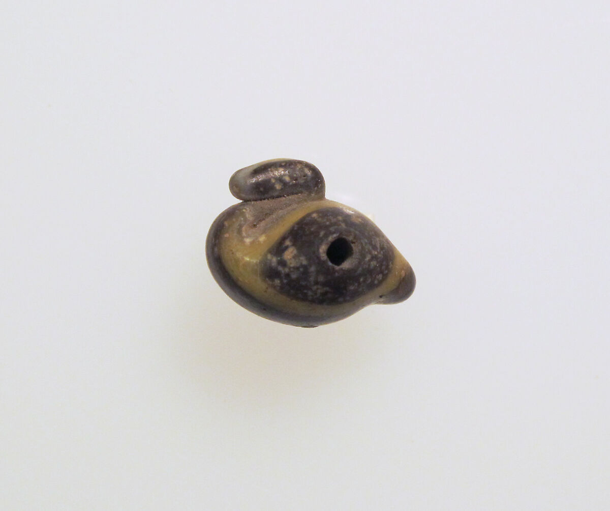Bead with hole pierced horizontally through body from side to side, shaped like a stylized bird (duck?), with neck curving backwards and long head, forming S shape, and a small round tail.