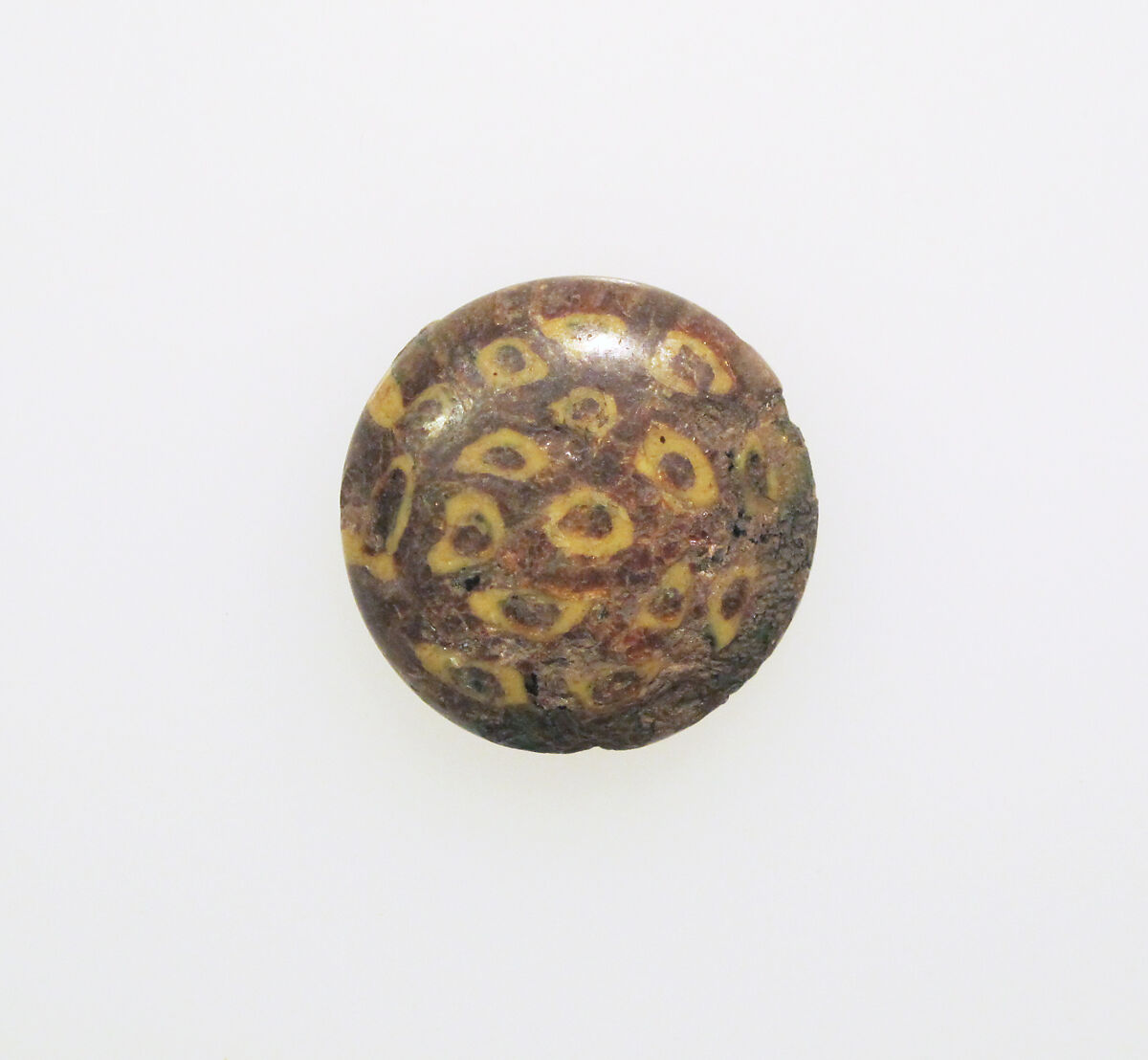 Intact, but slightly chipped around edge; dulling, brown weathering, and faint iridescence.