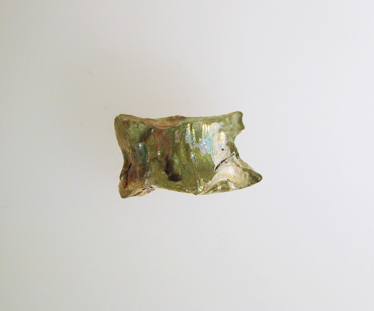 Part of one end broken and missing; pitting, dulling, and iridescent weathering.