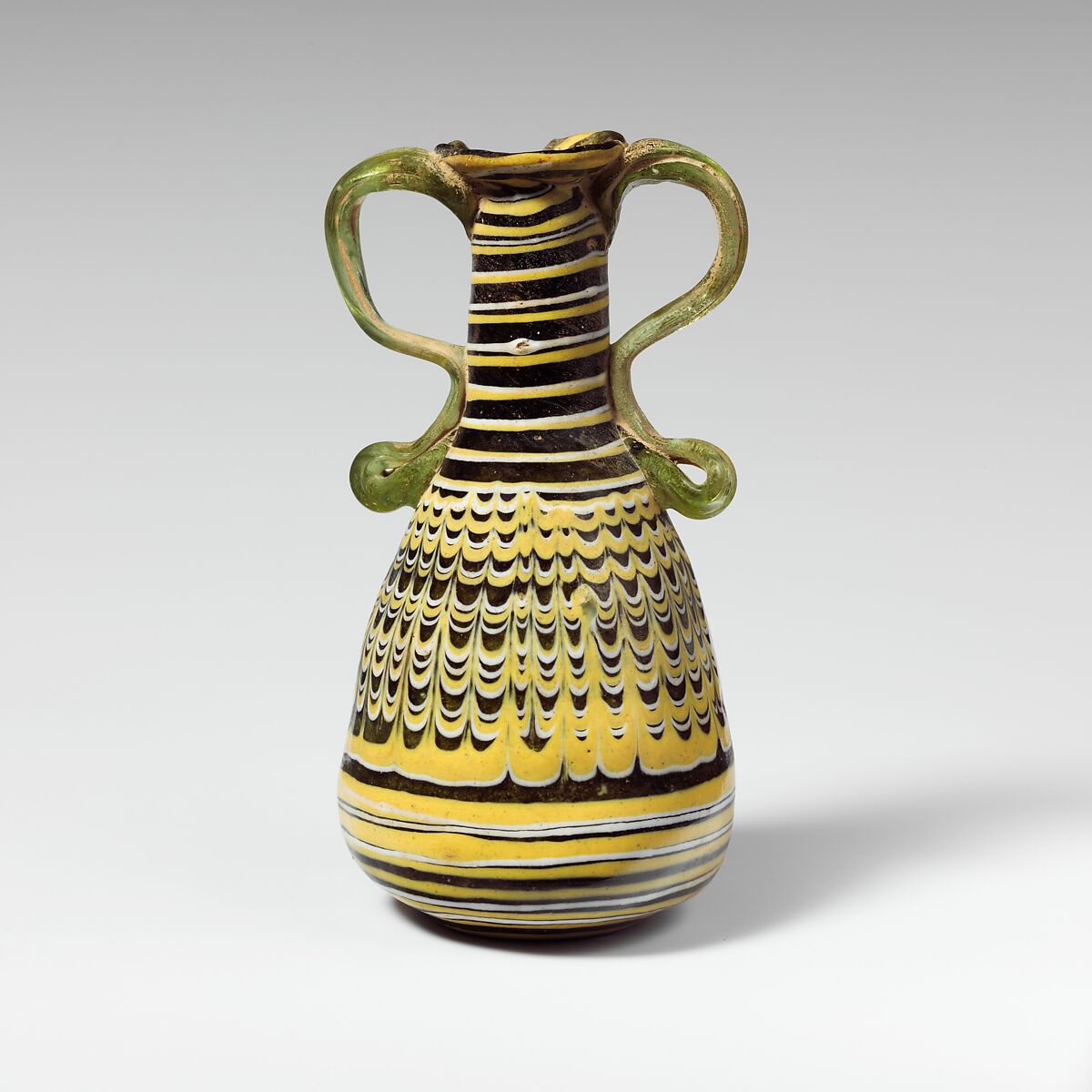 The production of core-formed glass was revived in the late Hellenistic period, and a smaller number of types and shapes of vessels were employed than in the earlier industry of the fourth to third century B.C. In addition, as seen here, the handles were now larger and were frequently made of a colorless or translucent glass.