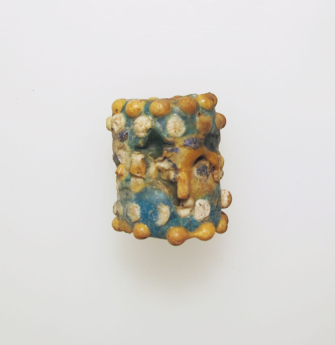 Broken and repaired, with some areas of fill, obscuring most of white face, and a few knobs missing or damaged; some pitting and iridescent weathering on exterior, enamel-like creamy weathering on interior of hole.