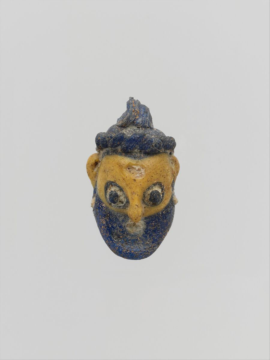Applied twisted headband in cobalt blue; upper half of face in yellow, with blue and white stratified eyes; beard in blue with small circular mouth, ears in yellow, and pendant earrings in white.