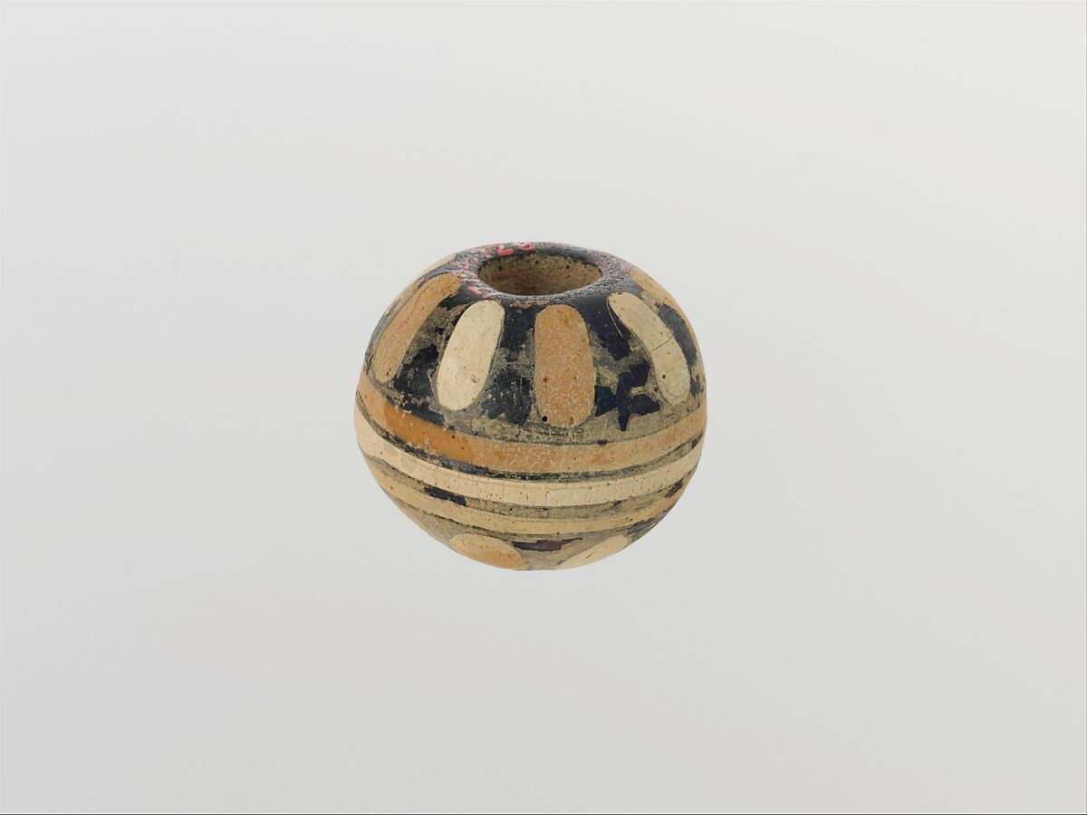 Three horizontal trails, two in yellow flanking one in white, around center of bead; at one end, row of eight marvered dots, five in yellow, three in white; at other end, nine broad stripes, five in yellow, four in white.