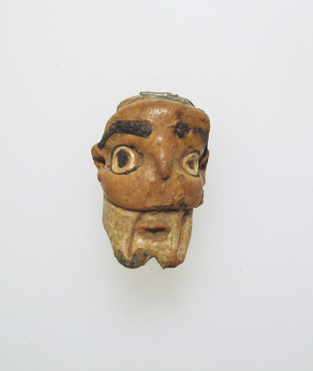 Suspension loop, most of nose, and proper right earring missing; some pitting and dulling, with enamel-like creamy weathering on most of blue green body of pendant.