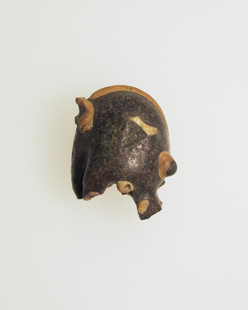 Broken on bottom edge at front and back, proper left eye, ears, central blob, and most of suspension loop missing; dulling and faint weathering, with thick reddish brown encrustation in rod hole.