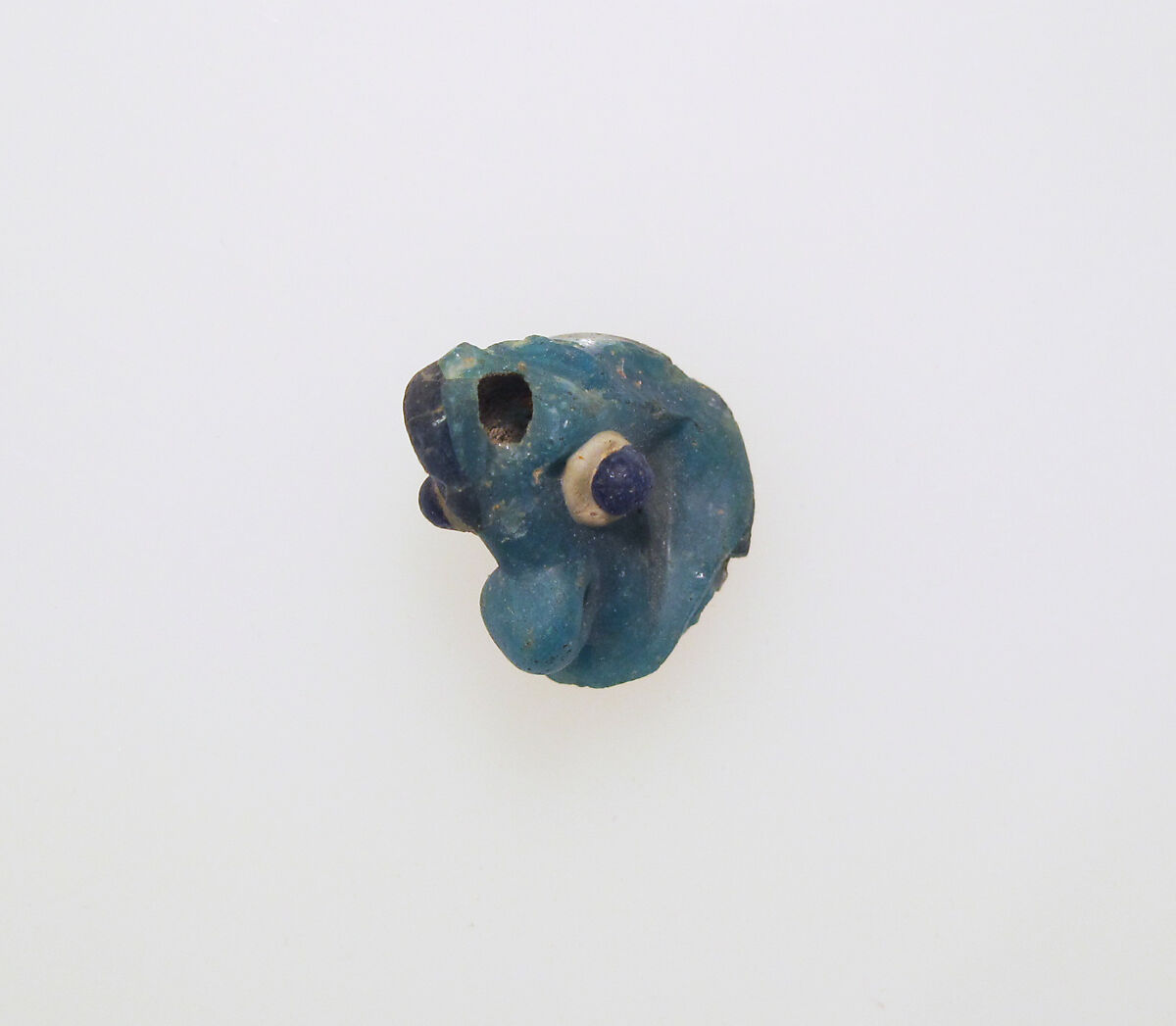 Broken with parts of edge and proper left eyebrow missing, and no trace of suspension loop remaining; slight dulling.