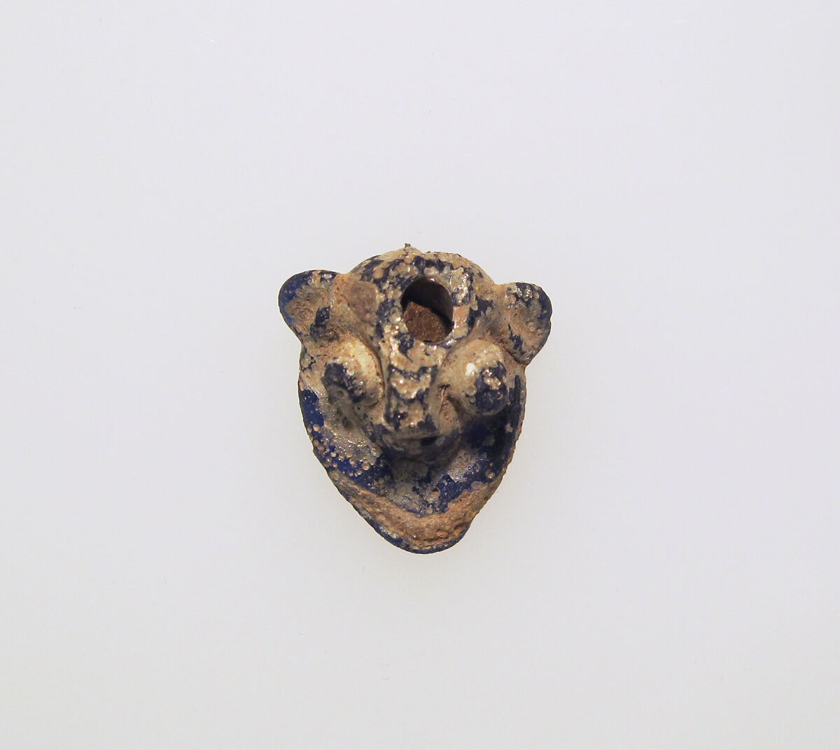 Weathered break in top of head, forming hole through to underside, and no trace of suspension loop remaining; pitting, creamy weathering, and iridescence.