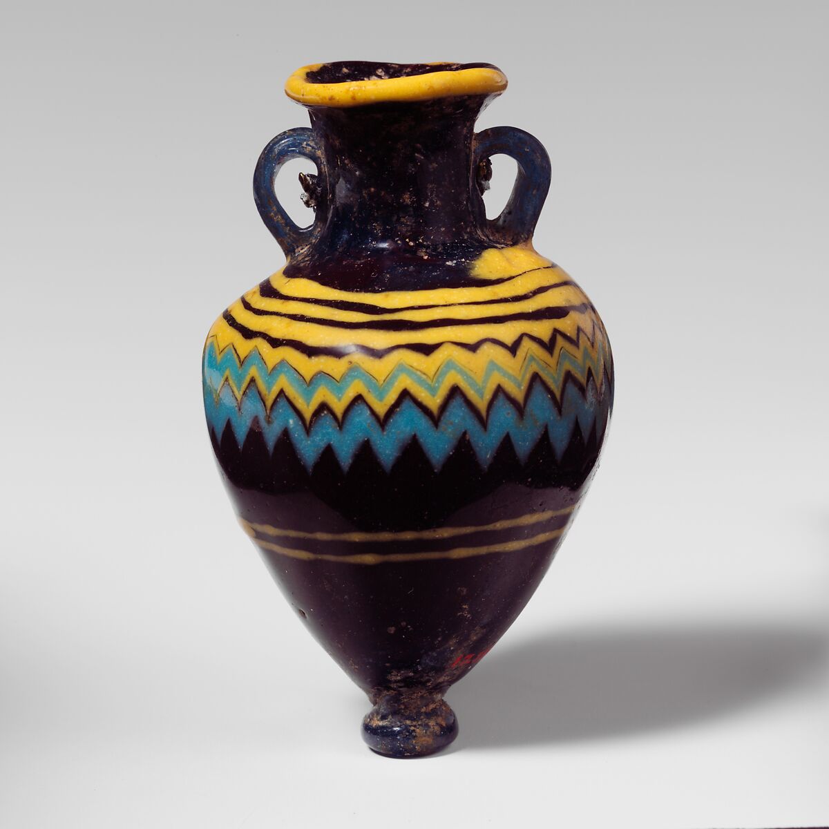 One yellow trail attached at edge of rim-disk; another thick yellow trail applied to shoulder and wound in a spiral around to top of body, then tooled into a close-set zigzag pattern on upper body, where a turquoise blue trail is added, mingling with the yellow; below this, a third fine yellow trail wound horizontally twice around lower body.