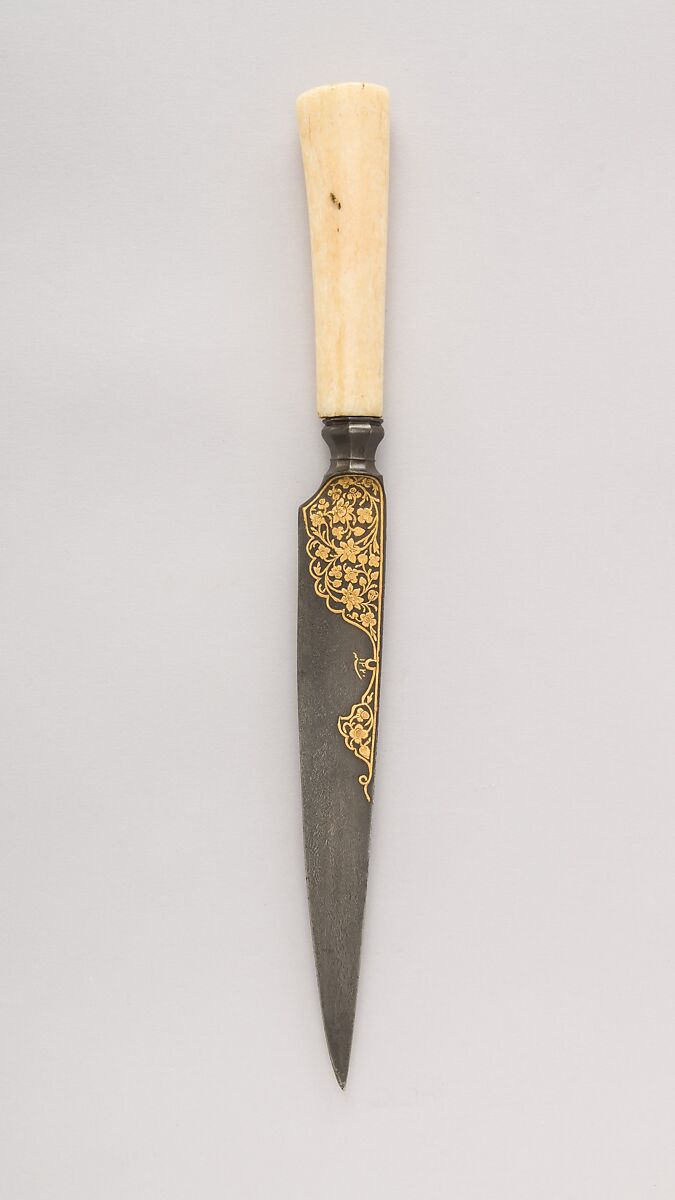Daggers of this type, with straight, single-edged blades and guardless hilts, known as kards in Persian, were worn as everyday utility knives. This deluxe example has a blade of crucible (“watered”) steel encrusted with gold flowers in relief and inlaid flush in gold with the maker’s name 'Ali Muhammad and the date.
