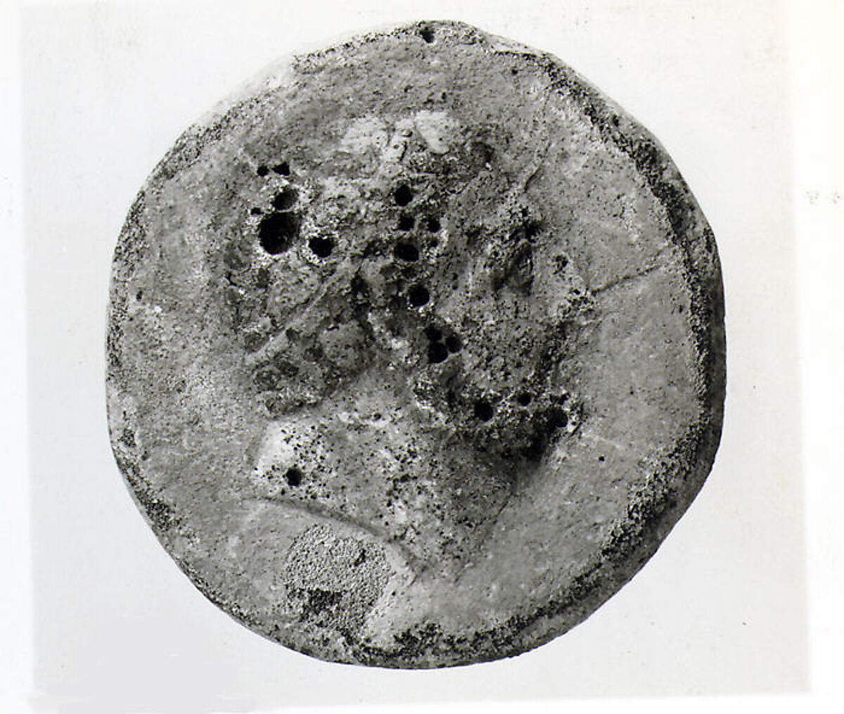 At center, large head in relief, facing right, with dark hair and beard, wearing a yellow (imitating gold?) wreath of ivy or vine leaves.