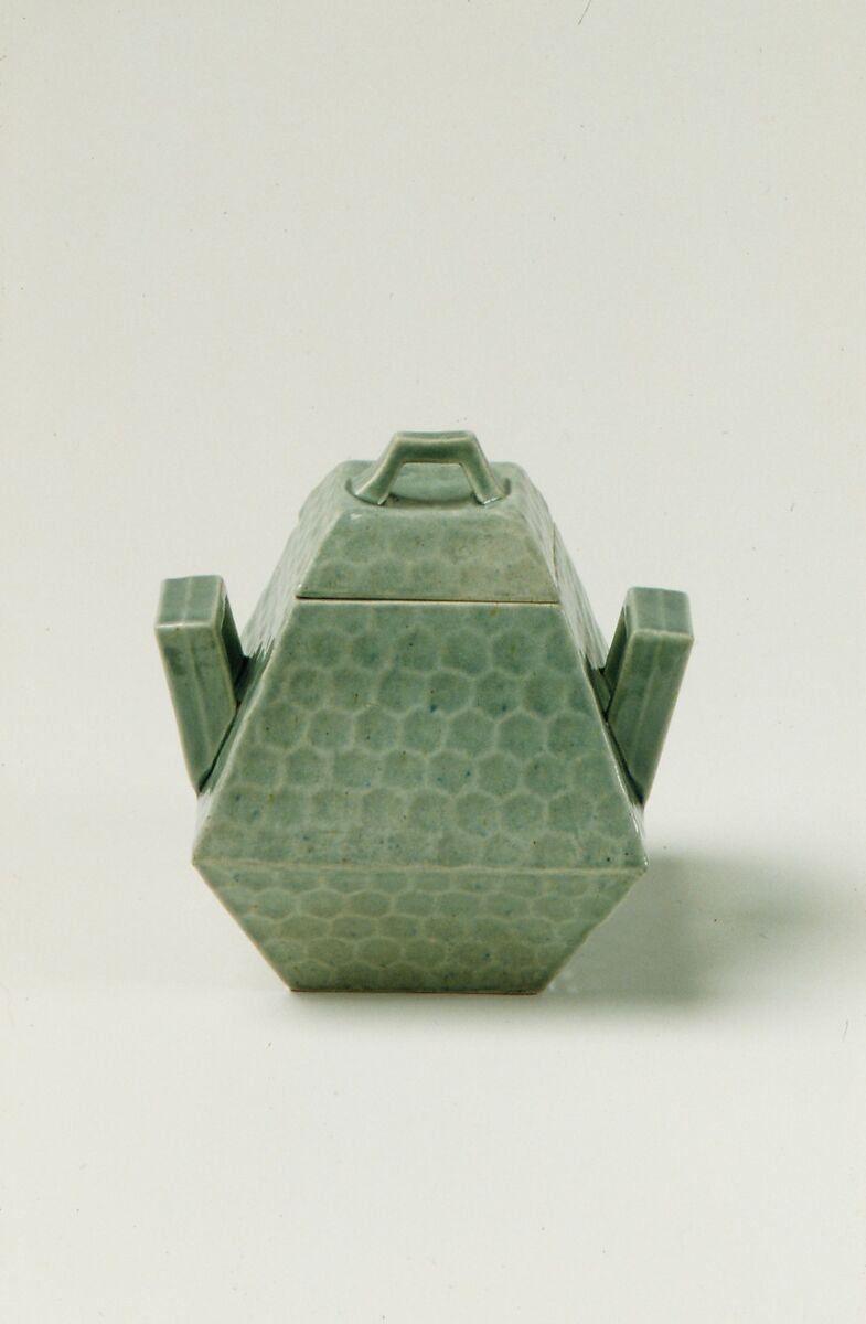 This rare example of domestic tableware by Chelsea Keramic Art Works exemplifies the taste for Far Eastern motifs during the last quarter of the nineteenth century. Its angular forms and honeycomb surfaces emulate the shape and hand-hammered texture of Japanese metalwork but also reference the designs of Christopher Dresser. The soft celadon glaze is the successful result of the firm’s extensive experiments to imitate and perfect the monochromatic glazes found on Chinese ceramics.