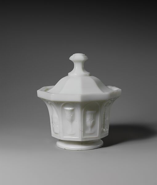 Each of the nine panels of this sugar bowl illustrates a different pressed-glass piece: a decanter; a goblet; a sugar bowl; an ale glass and spill holder in the “Excelsior” pattern; a decanter in the “Ashburton” pattern; a goblet in the “Flute” pattern; and a spill holder and hexagonal candlestick in the “Star” pattern. The bowl was probably used as an advertisement of some kind, perhaps one sent to glass