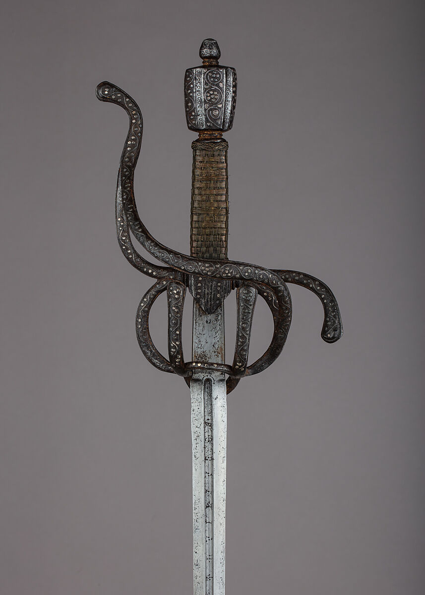 The rapier was the principal civilian sidearm throughout the sixteenth and seventeenth centuries. Designed for cut-and-thrust fencing of progressively complex techniques, the rapier is characterized by a double-edged blade with an acute point and an elaborate guard for the hand. The guards, usually of iron or steel, were subject to a variety of embellishment. They were engraved, chiseled, gilded, damascened, and encrusted in gold and silver in keeping with fashionable styles.