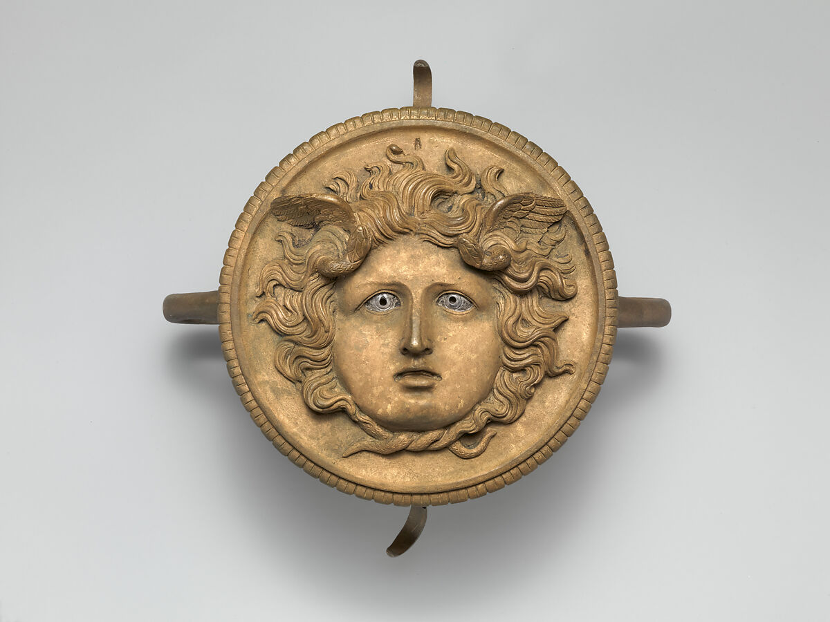 This heavy metal ornament, decorated with the head of Medusa and inlays of silver and copper, probably comes from a currus triumphalis (ceremonial chariot) used in processions rather than a lightweight racing chariot.