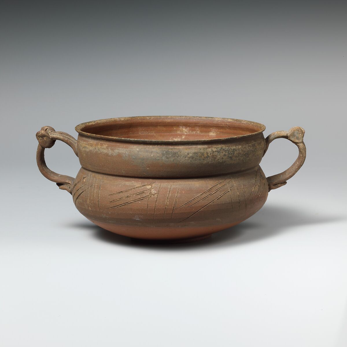 Incised lines on shoulder; two handles.