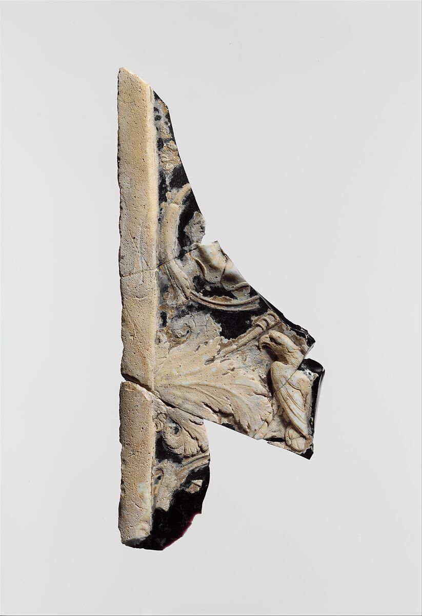The fragments come from a large revetment panel decorated with an elaborate acanthus frieze once inhabited by various animals and birds; only an eagle now survives. The size of the panel suggests that it formed part of the architectural decoration of a building. It was probably made in Rome and echoes the floral ornaments that decorated public monuments set up there in the Augustan age. It is so similar to another smaller fragment (18.145.38b) on display in the Study Collection (Gallery 171) that the two pieces may belong together.
