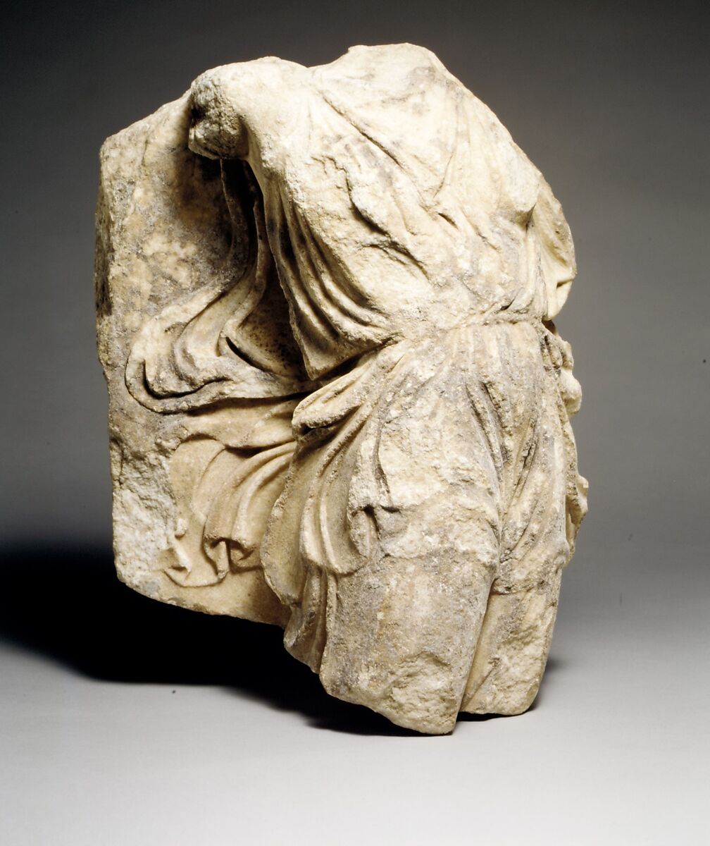 This figure must represent a Nike (the personification of victory) for a few feathers of her right wing are visible carved in low relief on the background. The wind-blown drapery that clings to her body and the ridgelike folds that form beautiful curved patterns are typical of the elegant mannered art of the late fifth and early fourth centuries B.C. Although this twisting figure brings to mind those on the reliefs that decorated the Nike Parapet at the entrance to the Athenian Akropolis, it must have been part of a metope or relief from a building or other temple constructed at approximately the same period.