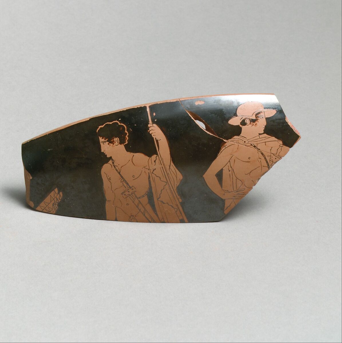 The preserved part of the cup would have shown a figure offering libations for the departing youths. They have swords and spears. The youth at the right wears a petasos, a traveling hat, suggesting a long journey.