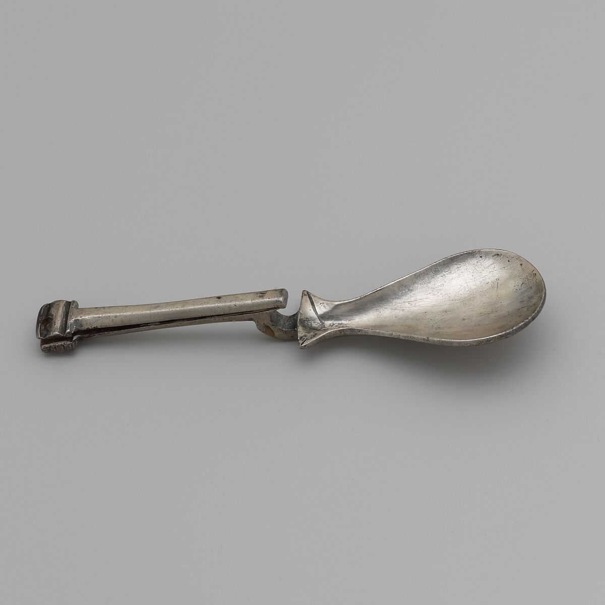 This eating utensil was originally a combination spoon and knife. The small iron knife that folded into the handle of the spoon is now missing, but one can still see the hinge and the slot along the handle for the blade. Another example (17.192.254) is on view in the Museum's galleries of Medieval Art.