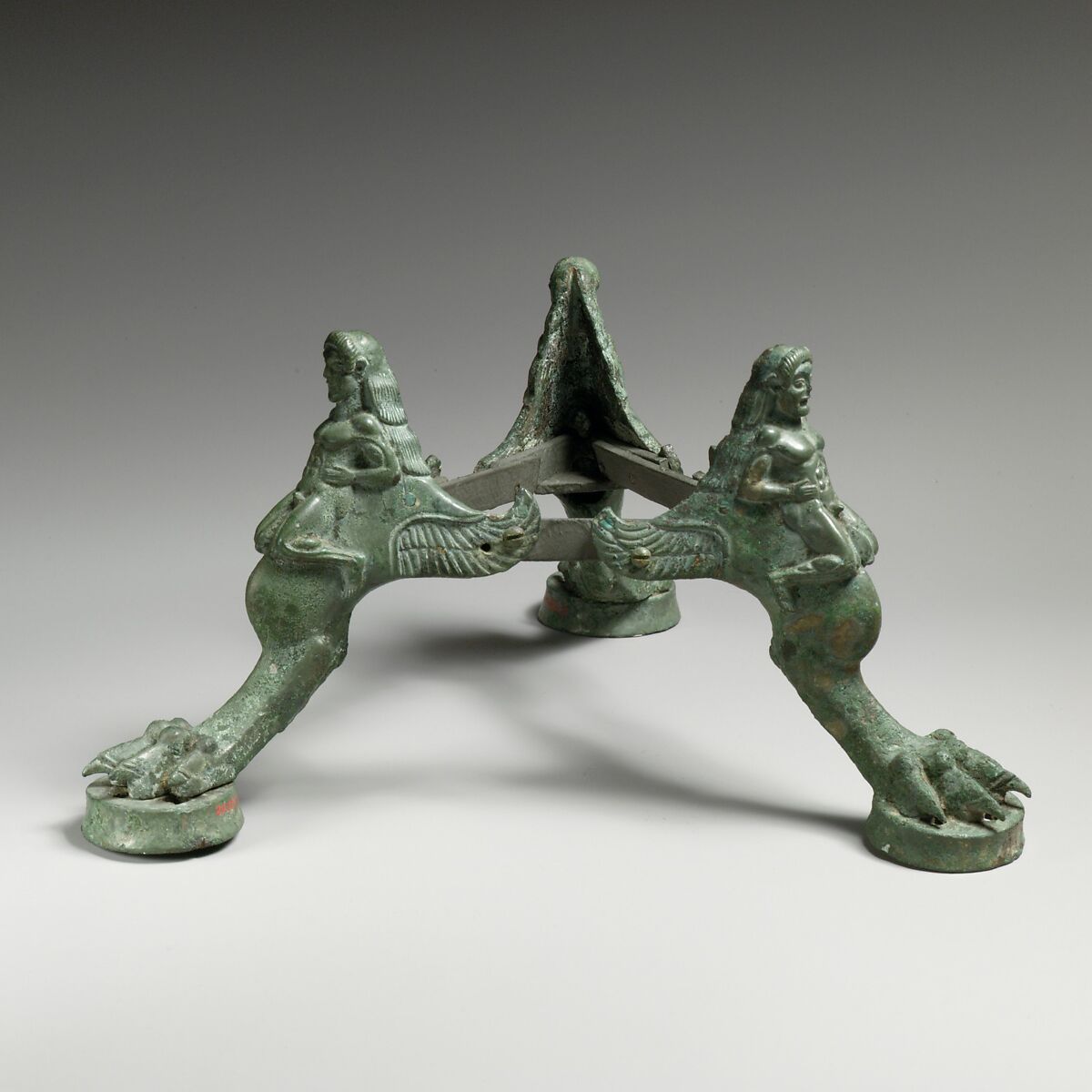 Originally, these solid-cast bronzes were attached to the base of a special type of pyramid-shaped incense burner known from more complete examples in the Vatican Museums and in Olympia. Each leg consists of a carefully rendered lion's paw with wings surmounted by a nude youth with long hair. This same motif was used on the legs of candelabra and cistae (toiletries boxes).