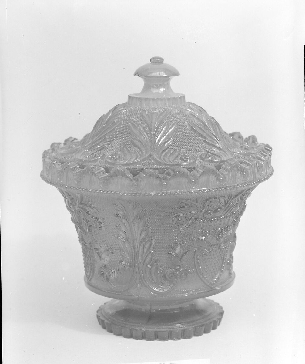 This covered sugar bowl is attributed to the Providence Flint Glass Works because of its strong similarity to marked salts made by that factory. The coloration of the piece in this collection is unusual. The bowl is pressed with alternating acanthus leaf and eagle-headed shield patterns, while the lid has six acanthus motifs.