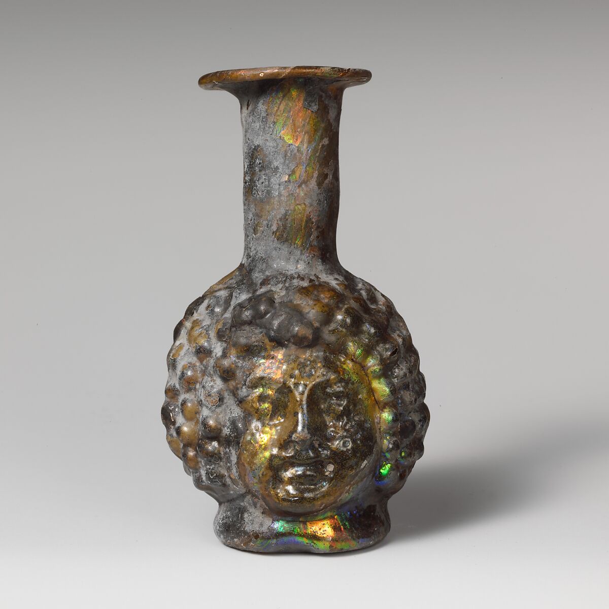 Intact, except for a small hole in hair of smiling face; dulling, slight pitting, patches of thick black weathering, and brilliant iridescence.