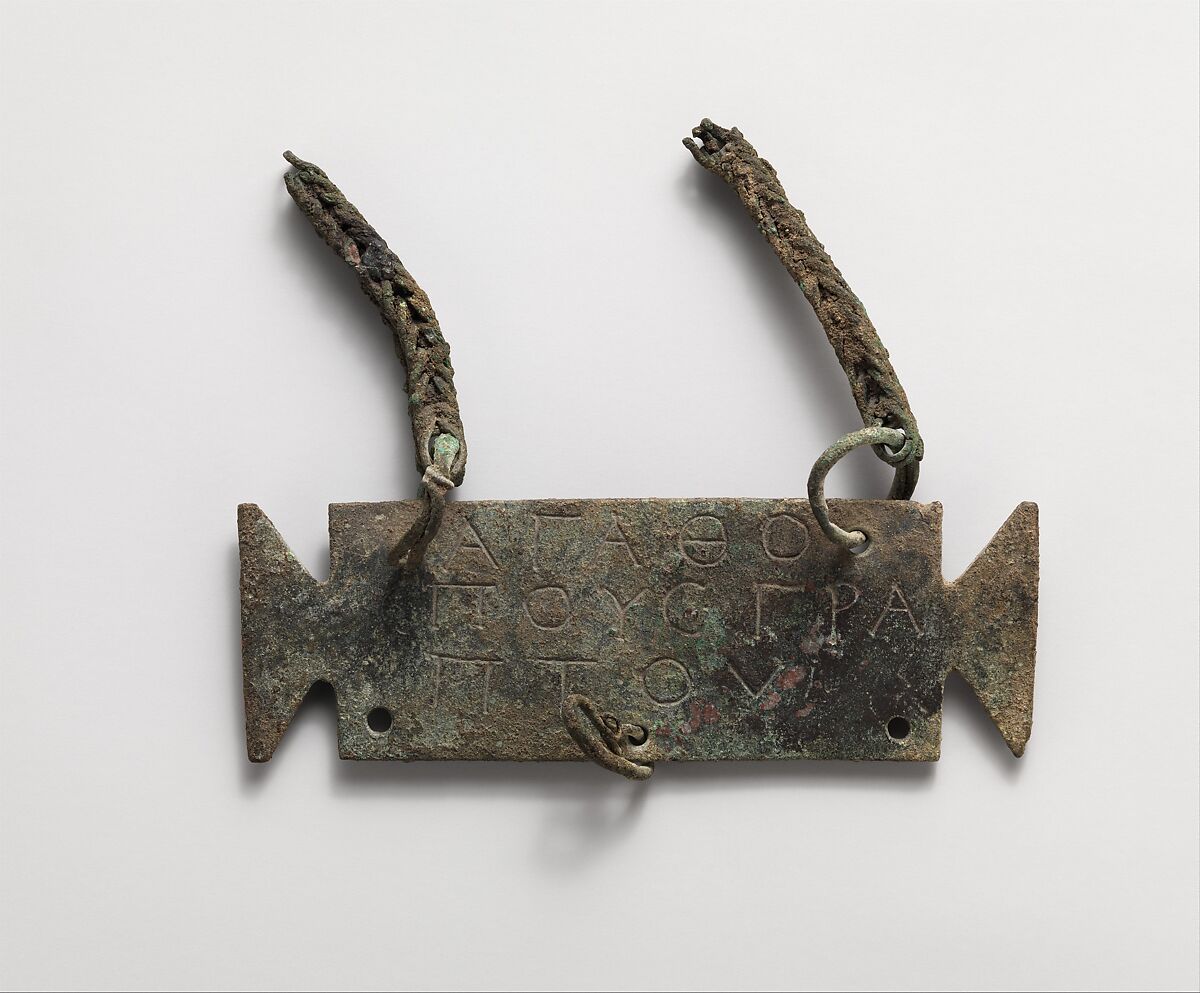 The tablet is in the form of a small tabula ansata, often used as the frame for dedicatory or funerary inscriptions. Here it is inscribed on both sides with a dedication in Greek to the Egyptian god Serapis.
