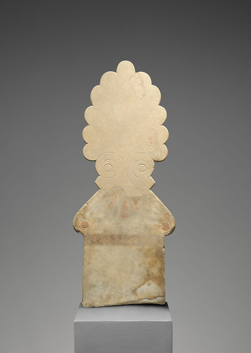 The finial consists of a pair of volutes combined with a pair of palmettes, the larger on top, the smaller between the volutes. The decoration was executed in fine incised lines supplemented with color. It is important to note that motifs, colors, and techniques such as incision were shared by media as diverse as sculpture and vase-painting in Athens at the end of the sixth century B.C.