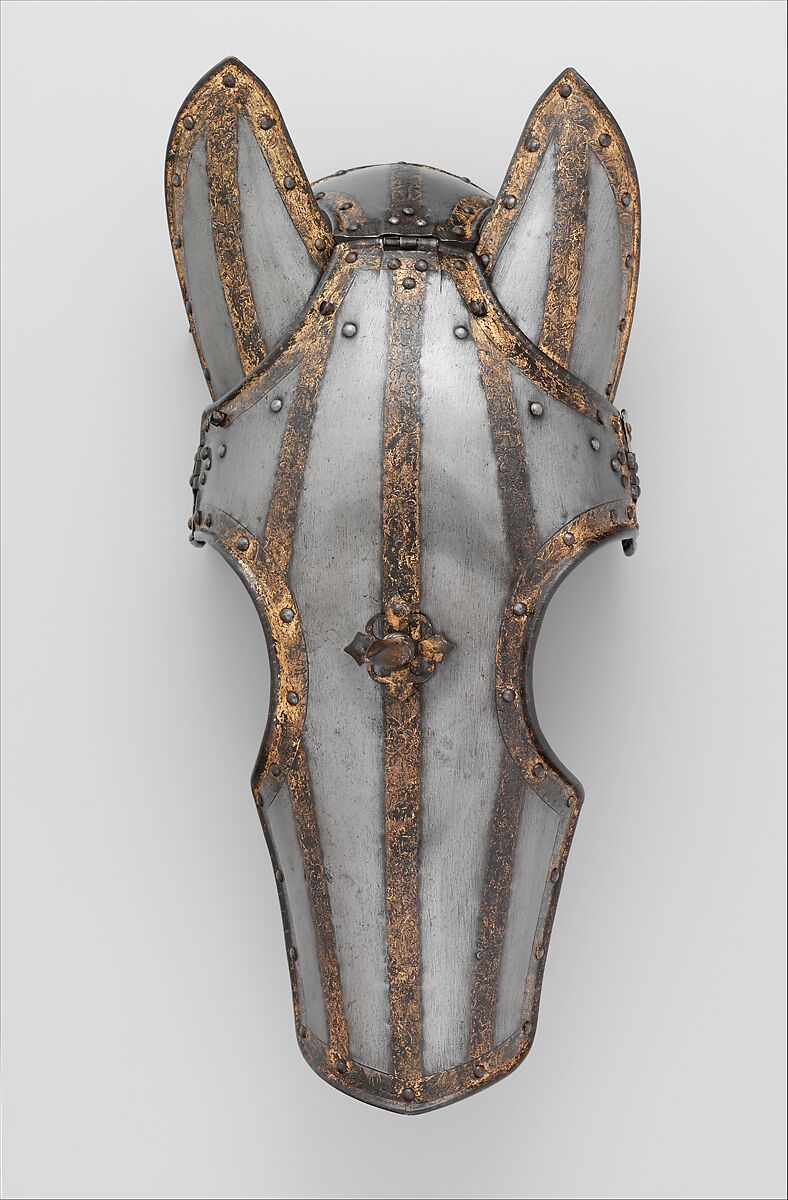 This shaffron is a late example of its kind and a rare specimen of probable Dutch manufacture. The main plate ends in a blunt point near the top of the nose and has wide cutouts for the eyes and ears. It is fitted with ear guards, which were originally attached by screws (one screw for each remains, the second now replaced by a rivet), small, hinged sideplates above the eyes, and a hinged poll plate. The edges of all the plates are turned and are followed by a series of steel rivets with gilt domed heads that secure portions of the original leather lining straps, indicating that the shaffron was once fully lined. Confined to narrow vertical bands over the main surfaces and similar bands around the edges, the decoration, which is chiseled and gilt overall, consists of flowers, trophies of arms, and bound captives suspended on a central ribbon, the background punched with tiny circles. The plain surfaces, now polished white, were formerly blued, but only traces of the bluing remain in the margins of the plates. At the center of the main plate is a spike set on a washer that is decoratively cut and pierced in the form of four conjoined fleurs-de-lis; the spike and washer are gilt.