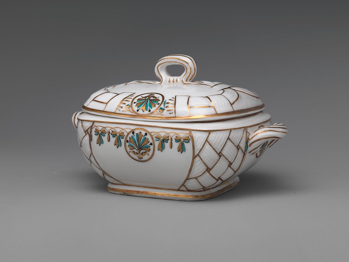 Union Porcelain Works was one of the most important and inventive American porcelain manufacturers in the second-half of the nineteenth century. In addition to their imaginative works designed by the German-born artistic director, Karl H. L. Müller, the firm’s mainstay was the production of heavy porcelain hotel dinnerware. This extensive service was made by Thomas Carll Smith, head of the Union Porcelain Works, as a gift to his daughter, Pastora Forest Smith Chace. The neoclassical decoration of the gilt bellflower and basket motif is complimented by turquoise enamel. Unlike the firm’s more eccentric and lavish designs created for their display at the Philadelphia Centennial Exposition in 1876, the pottery favored a more restrained classical style for their dinner services. This service descended in the Chace family.