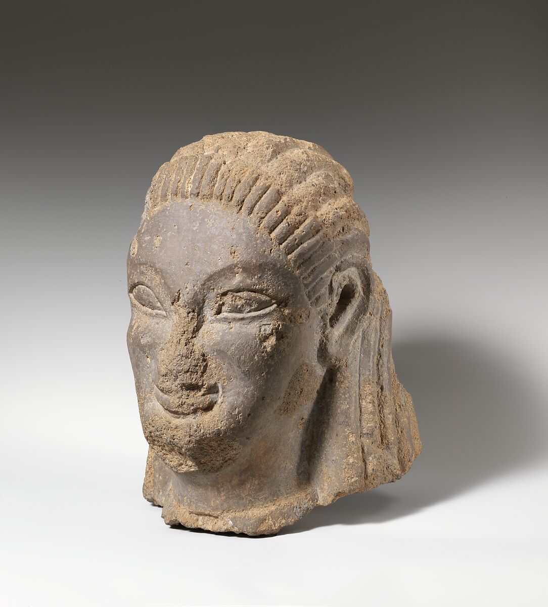 This large head, made of volcanic stone, probably represents a sphinx or siren. Statues of both mythical creatures, usually depicted by the ancients with human female heads and winged animal or bird bodies, were often placed as guardians near the entrances to Etruscan tombs. The large winged lion on display in this gallery is a better preserved example of this type of stone sculpture. The style of this female head, with its almond-shaped eyes, Archaic smile, and wig-like hair arrangement is strongly reminiscent of Greek, especially Ionian examples. A number of related sculptures, all associated with ancient tombs at Vulci, are in other collections. One of the closest parallels for the Museum's head is in the Ny Carlsberg Glyptotek, Copenhagen.