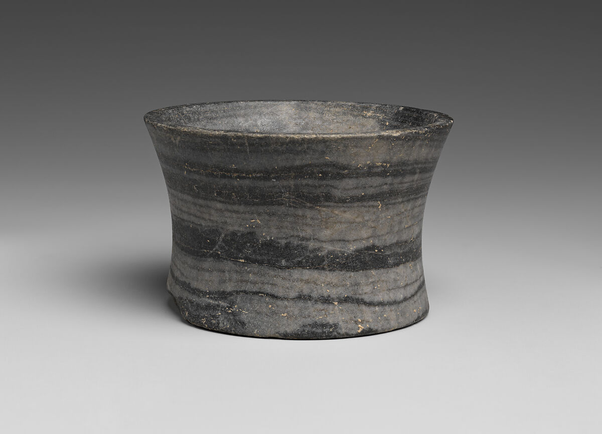 Minoan artists crafted vessels from a variety of stones using chisels, hammers, and copper-alloy saws. Finer tools like copper drills with abrasives were employed to hollow out their interiors. These vessels were durable versions of standard terracotta and metal forms, made with such high quality that they were exported throughout the Eastern Mediterranean. Stoneware has been found in settlements, cemeteries, and sanctuaries alike; the smallest examples were likely votive offerings.