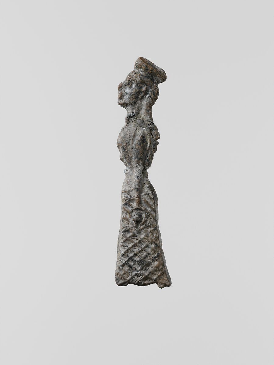 Small flat votive figurines of cast lead have been found in great quantities at the ancient sanctuaries of Laconia; over one hundred thousand, dating from the seventh century B.C. to the Classical period, were dedicated to the goddess Artemis Orthia in Sparta.