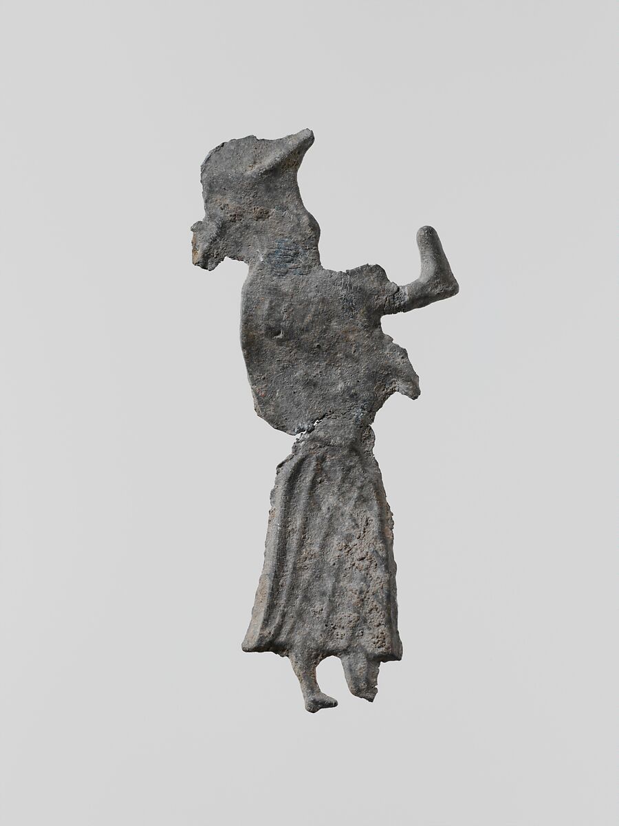 Small flat votive figurines of cast lead have been found in great quantities at the ancient sanctuaries of Laconia; over one hundred thousand, dating from the seventh century B.C. to the Classical period, were dedicated to the goddess Artemis Orthia in Sparta.