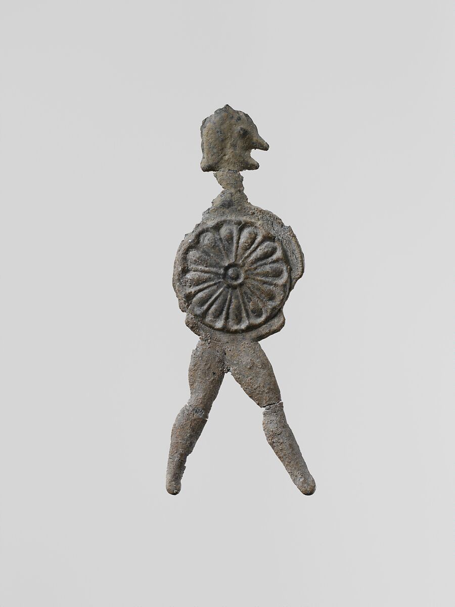 Small flat votive figurines of cast lead have been found in great quantities at the ancient sanctuaries of Laconia; over one hundred thousand, dating from the seventh century B.C. to the Classical period, were dedicated to the goddess Artemis Orthia in Sparta.