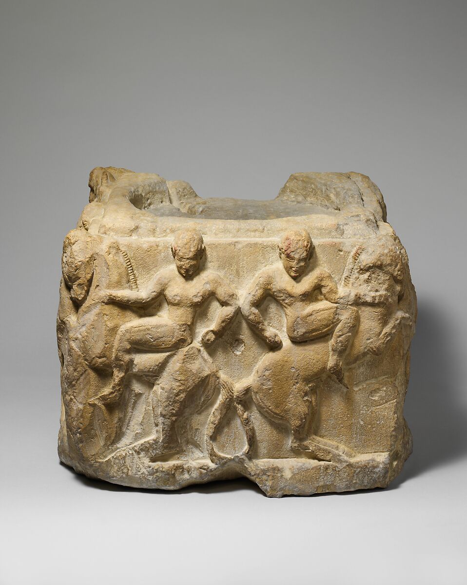 A cippus is a large stone marker used by the Etruscans to establish a boundary or, more commonly, to mark the location of a tomb. The Etruscans produced several types of cippi. This example, the only one in the Museum's collection, is a cubic block that originally would have supported a large spherical, onion-shaped, or pointed stone. Each side of the block is carved with an identical scene showing symmetrically disposed horsemen. These almost certainly represent the twin gods, Castur and Pultuce (Roman: Castor and Pollux), among the most popular deities worshiped by the Etruscans. This type of cippus is closely associated with Chiusi, an important city in Central Italy.