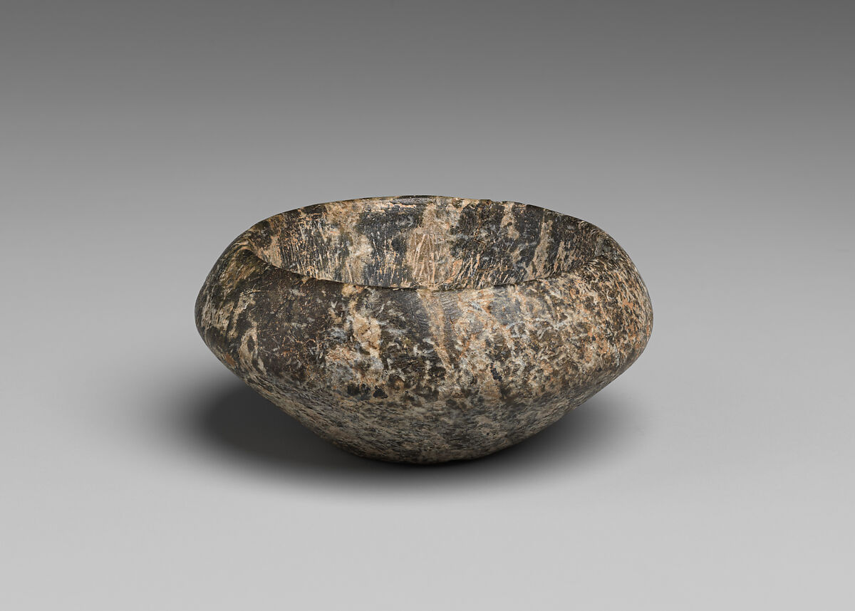This diorite bowl is defined as carinated. Derived from the Latin word carina, "the keel of a ship," carination refers to the part of a vase that widens out and narrows back sharply.