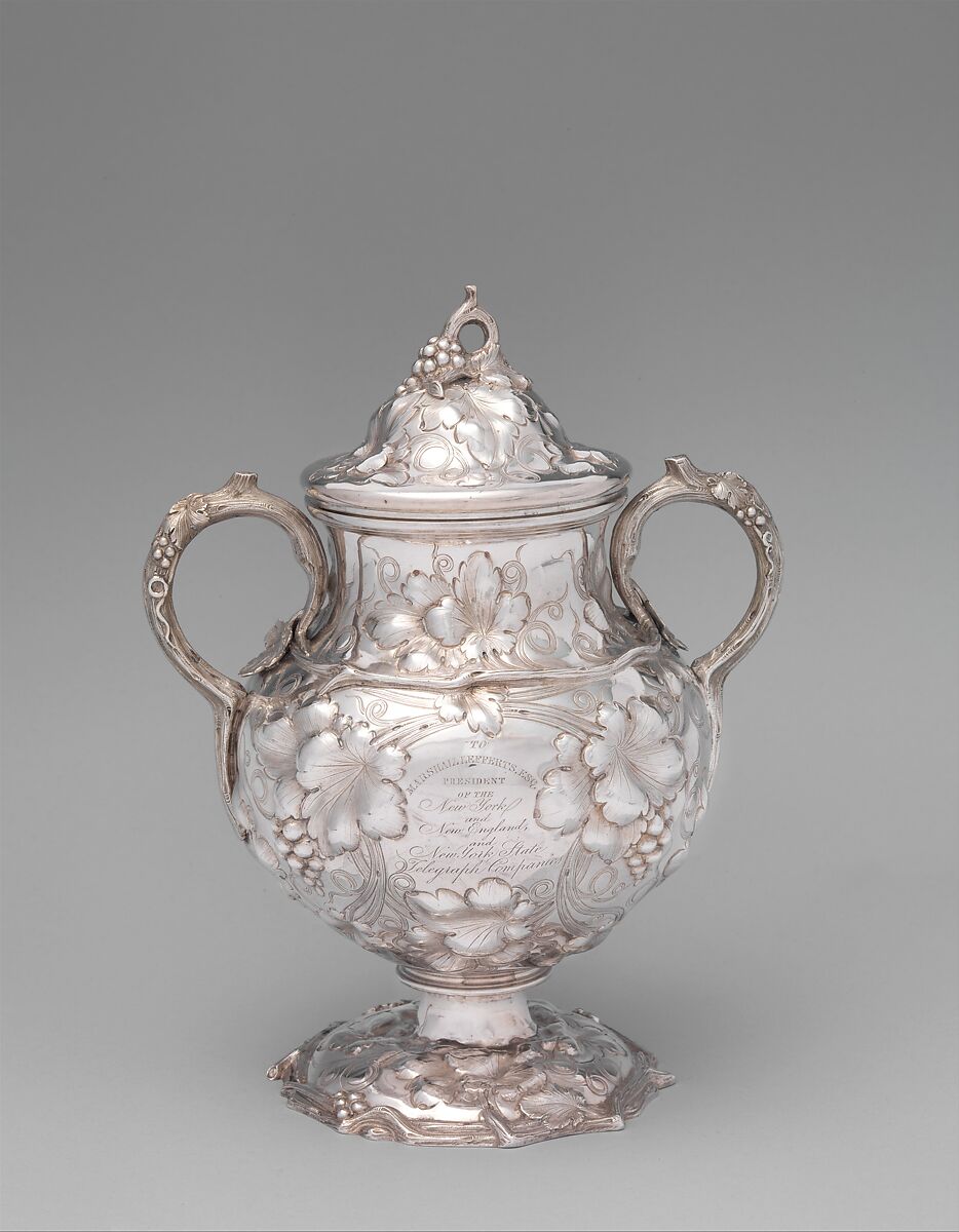 In 1850, Marshall Lefferts, president of the New York and New England and the New York State telegraph companies, was presented with "a splendid service of plate" to honor his construction of telegraph lines from New York to Boston and Buffalo. It was designed by John C. Moore in the "modern French" style, with floral chasing and rusticated castings. Surmounting the kettle is a figure of Zeus holding lightning bolts—an allegory of electricity.