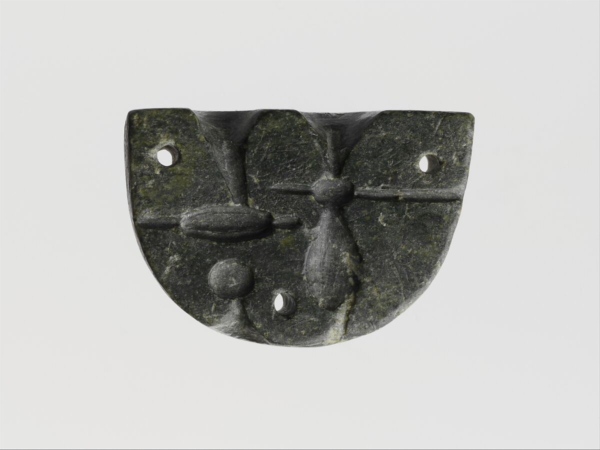 This serpentine carved object is half of a two-part mold that was used to cast gold beads. The two parts were attached by the three holes, visible at the top and bottom. The funnel-shaped cuttings along the straight edge are the sprues through which the liquid metal was poured into the mold.