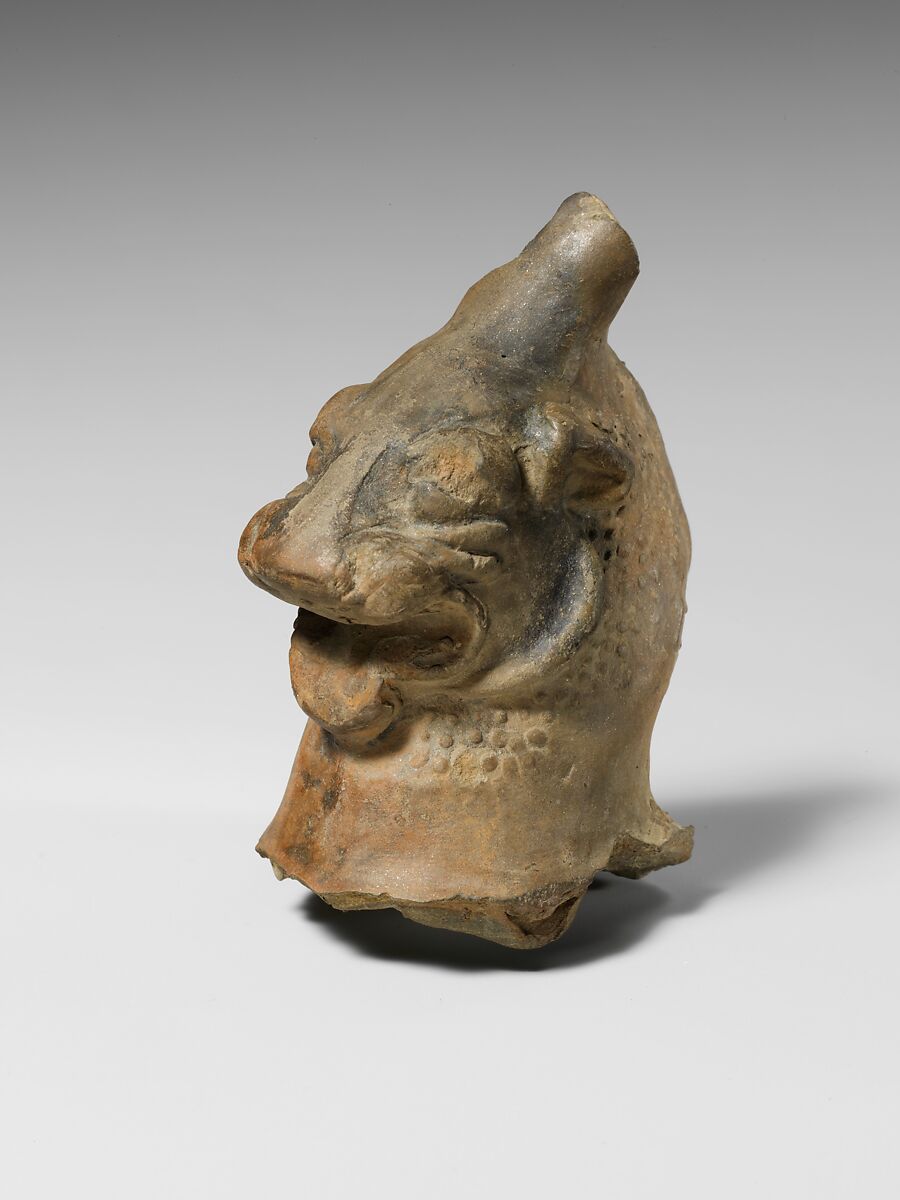 In the Hellenistic era, the heraldic griffin, with the body of a lion and the head and wings of an eagle, could take on many different styles and themes. The style of this griffin appears to have Near Eastern influence and may have been the protome of a rhyton.