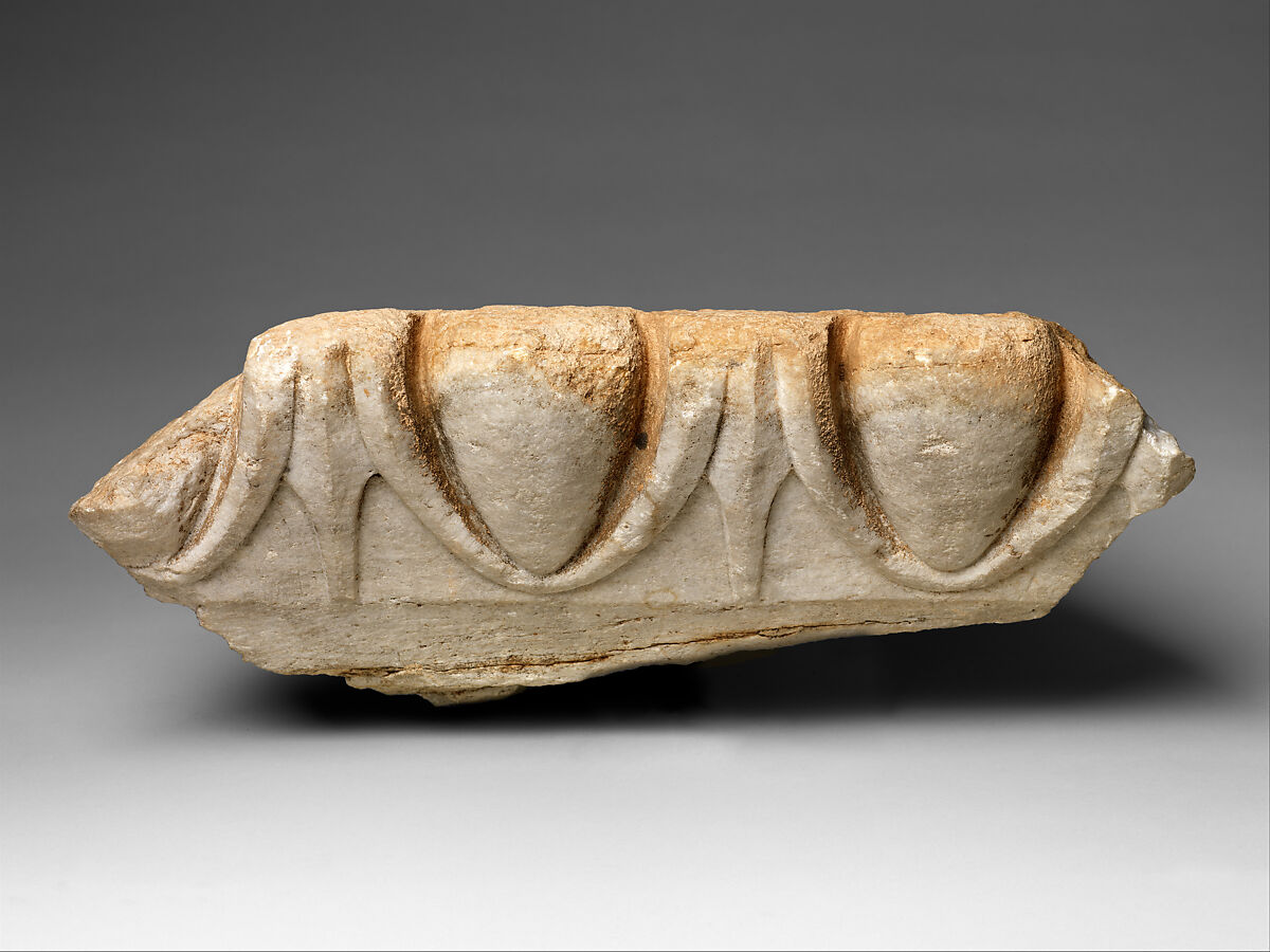 This fragment of egg and dart decoration is from the crowning element of an an Ionic column capital from the Temple of Artemis at Sardis. Identical ornamentation can be seen on the Museum's Sardis column (26.59.1) displayed nearby.