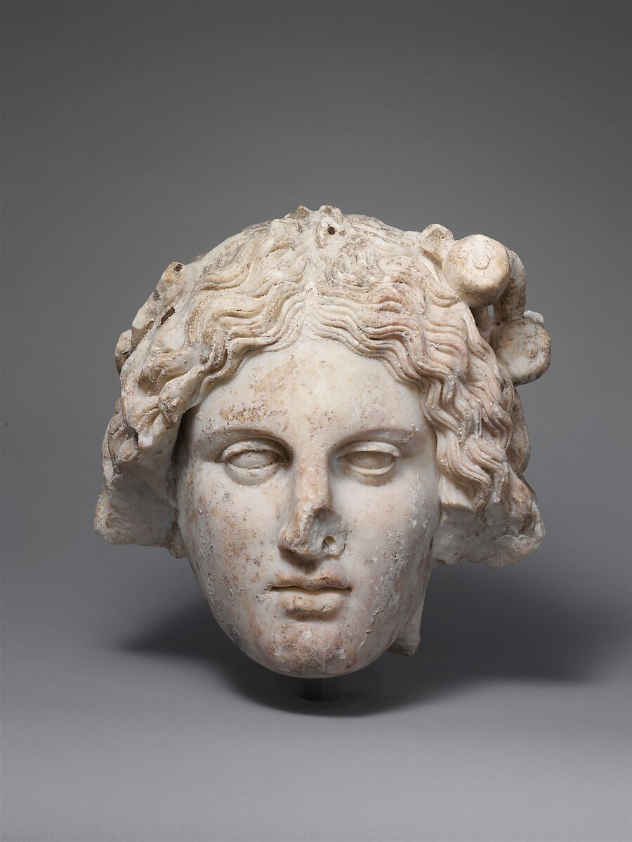The wreath with pomegranates suggests that this head represents a deity, such as Ceres, who was associated with the generative powers of nature.
