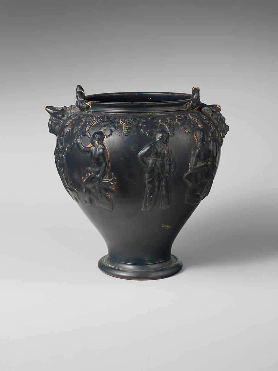 The story of Apollo and the satyr Marsyas is depicted in high relief around the vessel. Under each handle are additional reliefs that imitate treatments of this shape as they appear in metal. Fine bronze situlae have been found at many sites in Northern Greece, Thrace, Southern Russia, and Western Europe. Scholars debate their ultimate origin but most are probably Etruscan exports from Vulci.