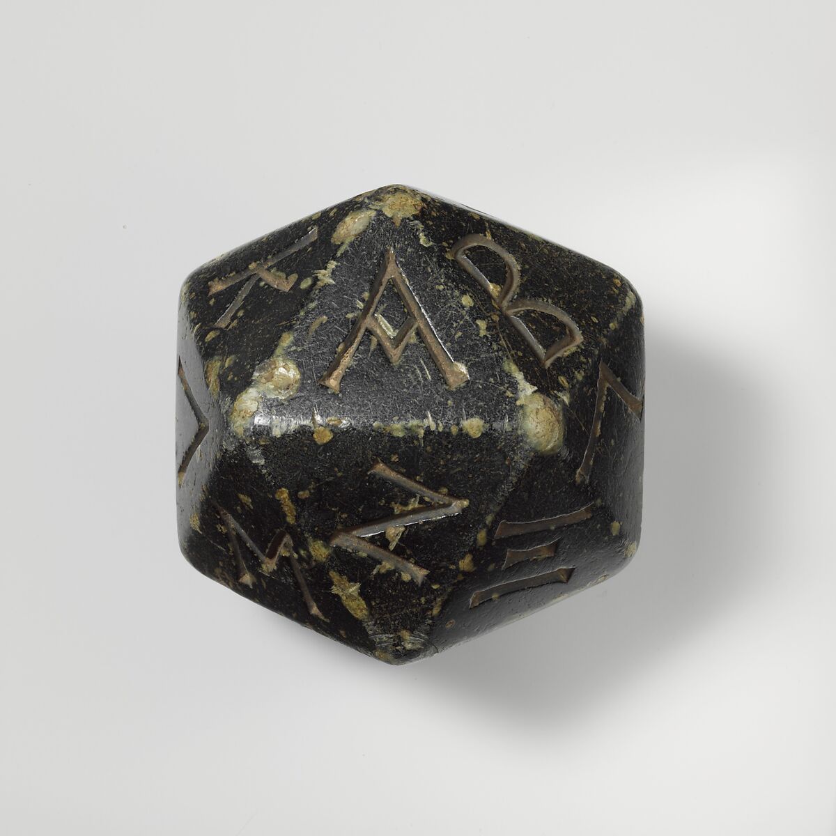 The polyhedron has 20 sides, each inscribed with a letter of the Greek alphabet from A (alpha) to Y (upsilon), so that only the last four letters (phi, chi, psi, and omega) are missing. See a faience example (37.11.3) also displayed in this case.