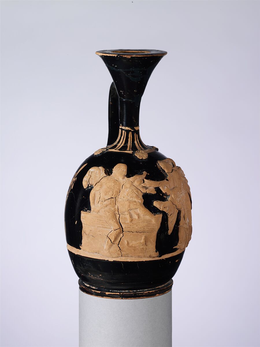 This vase is as noteworthy for the rare scene as for the rendering in low relief.