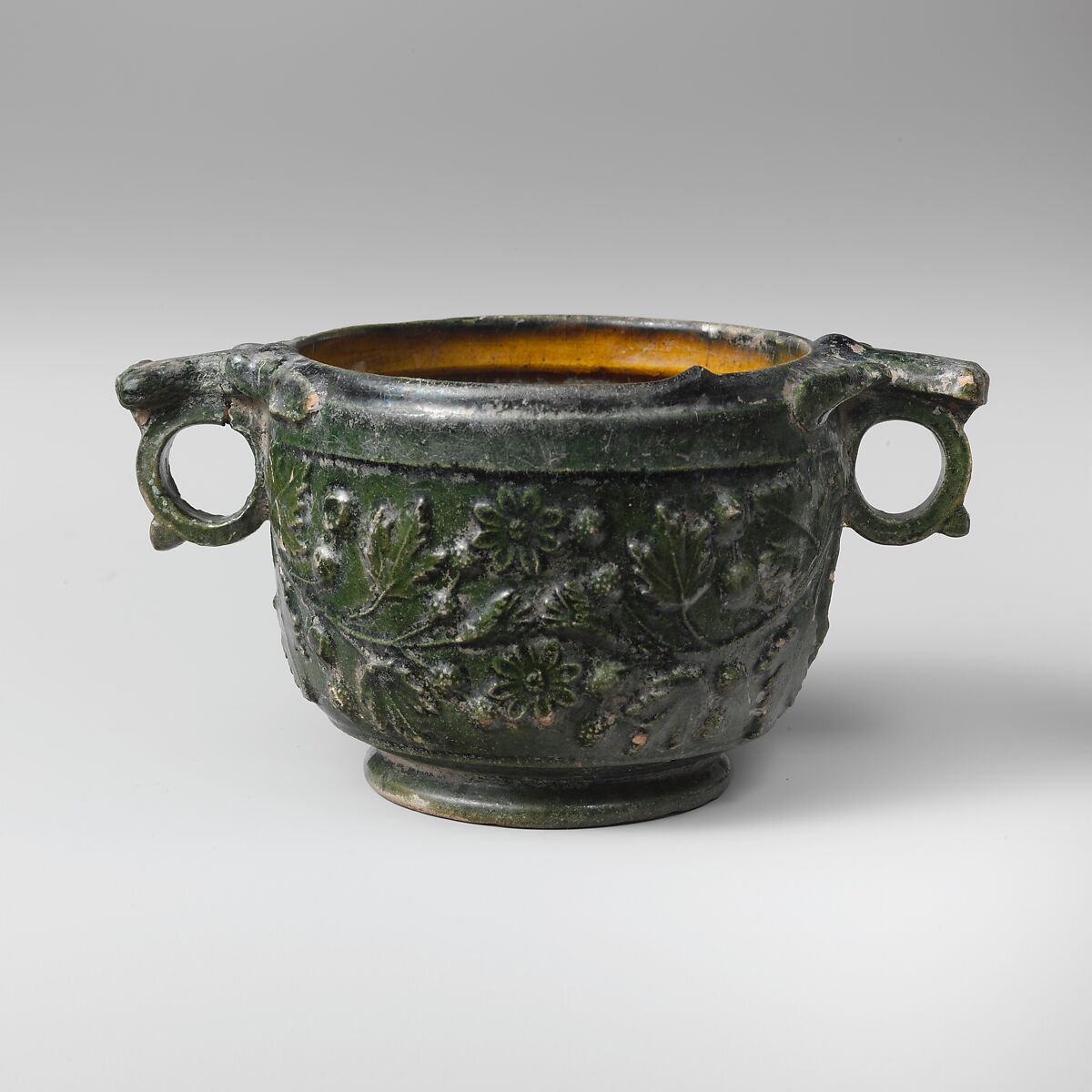 Lead-glazed cup decorated with leafy sprays, fillets and rosettes.