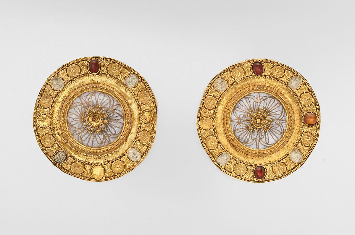 - Title: Pair of gold and rock crystal disks, set with garnet and glass inlays