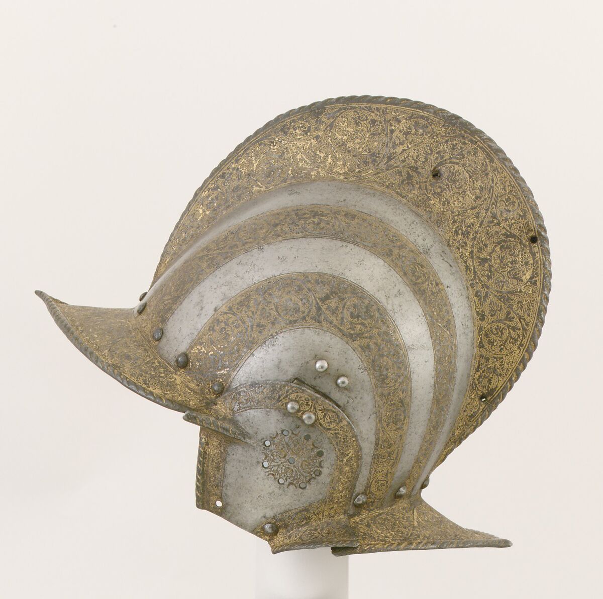 The etched and gilt ornament, consisting of elegantly drawn foliate scrolls on a background of circles, matches that on the contemporary field armor of Cornelio Bentivoglio (Kunsthistorisches Museum, Vienna), a soldier in the service of the dukes of Ferrara. Both presumably were made iin the same workshop, one that appears to have specialized in fabricating arms for the Ferrarese court. Similar etching can be seen on other helmets in the Metropolitan Museum's collection, acc. nos. 29.152.2 and 37.189.13.