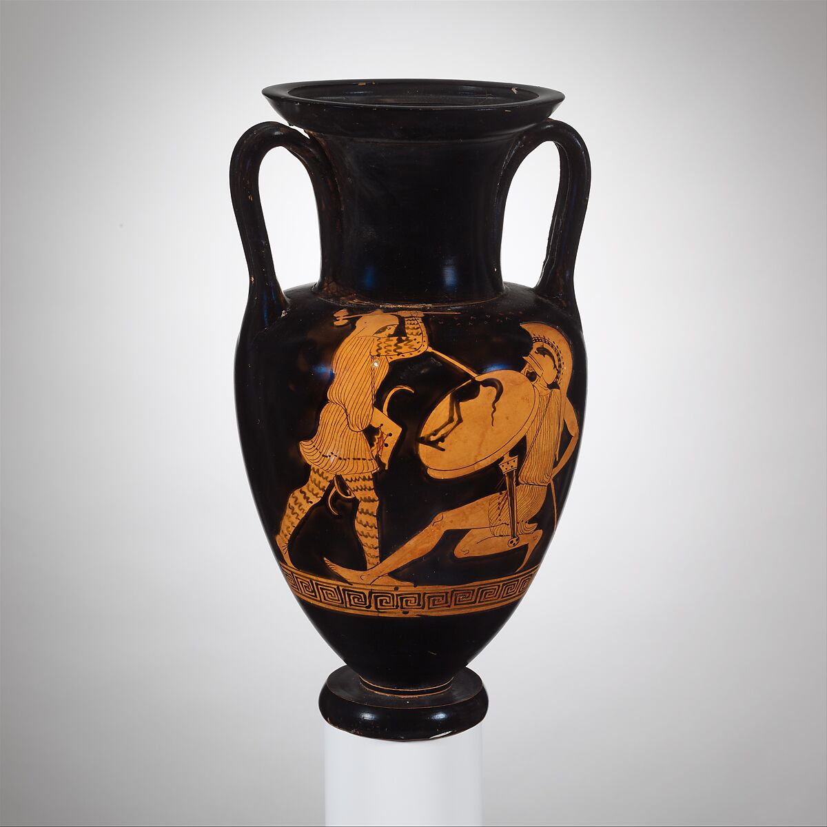 The Amazons were famous horsewomen. It is interesting, therefore, that the device of the Greek warrior's shield consists of the hindquarters of a horse.