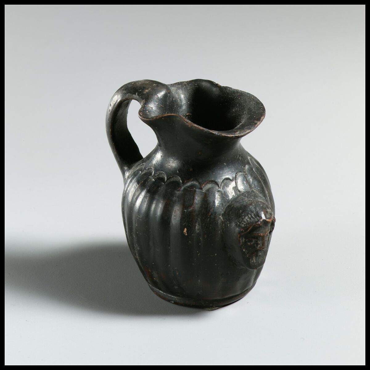 The body is ribbed and has a small head of a bearded man projecting at the front. The concept is noteworthy because figural embellishments usually occur at the bottom or the top of the vertical handle.